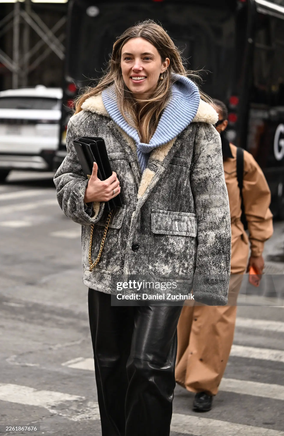Continuing with the leather pieces, Aemelia Fay was seen in leather pants, a gray and white jacket, a black leather clutch, and a muted light blue sweater. I love the cohesion the two leather pieces bring to this look. She nailed the pop of color as well, through the bit of her light blue sweater showing. She’s staying on trend- light blue is widely anticipated to be the most fashionable color of 2026. Fay has a substack called Taest Bud (one of my favorites) where she broke down her NYFW looks!
