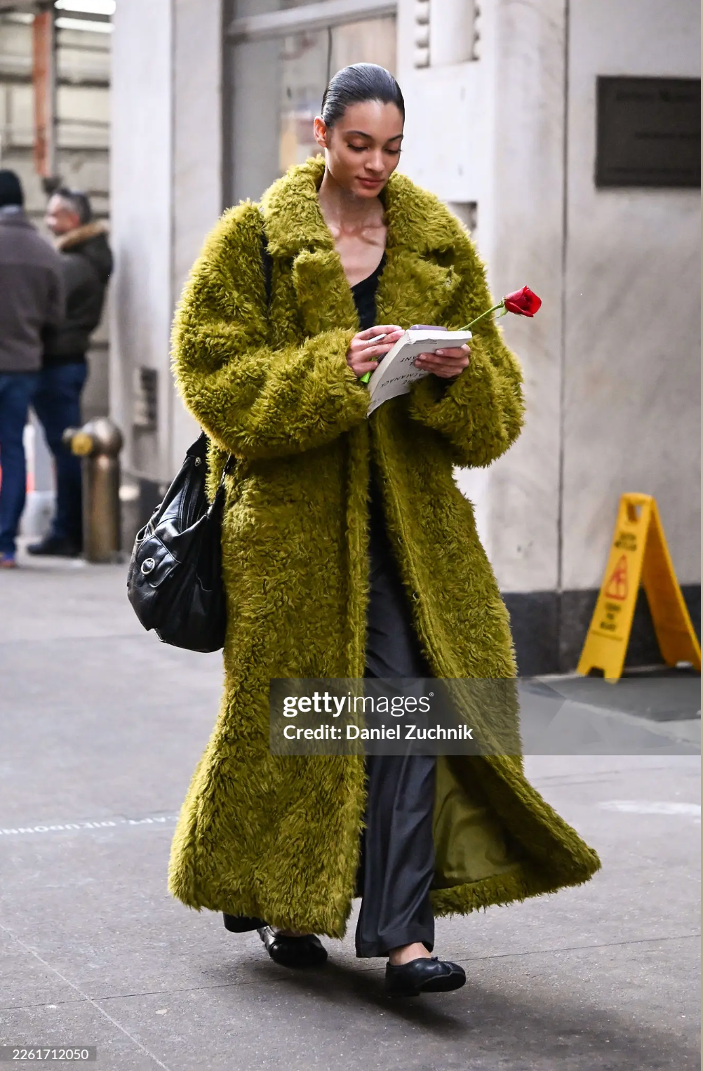 Again with the faux fur trend, model Mary Alejandra Diaz is seen wearing an ankle-length moss green jacket, gray pants, and a black bag and a classic- Margiela tabis. I absolutely love how her fur isn’t a traditional color, and how the “pop” of color in her look is actually the main piece itself, while the rest of her outfit is relatively monotone. The rose in her hand makes the perfect unexpected accessory!