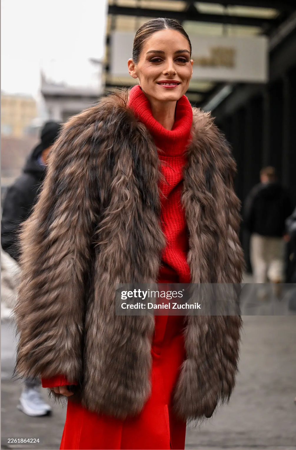 Next is socialite Olivia Palermo, who is wearing a bold faux fur brown coat and a bright red knitted sweater and skirt set. My favorite part about this look is the coordination of the warm tones, and her sweater’s neckline. Funnel neck tops were extremely popular- they were seen on many celebrities off duty.
