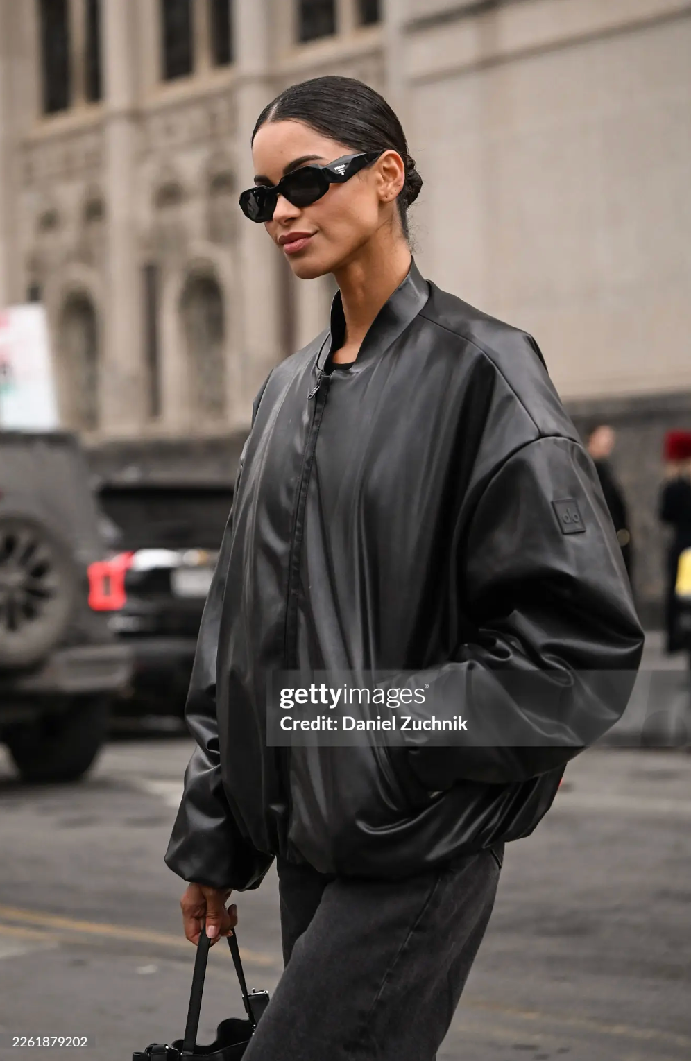 First is model Daiane Sodre, who is seen wearing a tasteful monochrome, all-black look. She has a baggy leather bomber jacket on, chunky Prada sunglasses, and a black bag. What I love most about this look is how it looks so effortlessly maximalist and minimalist at the same time. The all-black gives it composition and allows for the minimalist parts of the look to shine, while the big sunglasses and jacket give it a natural maximalism.