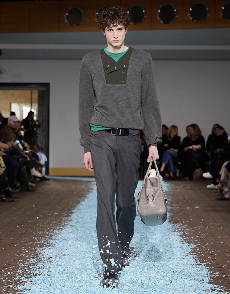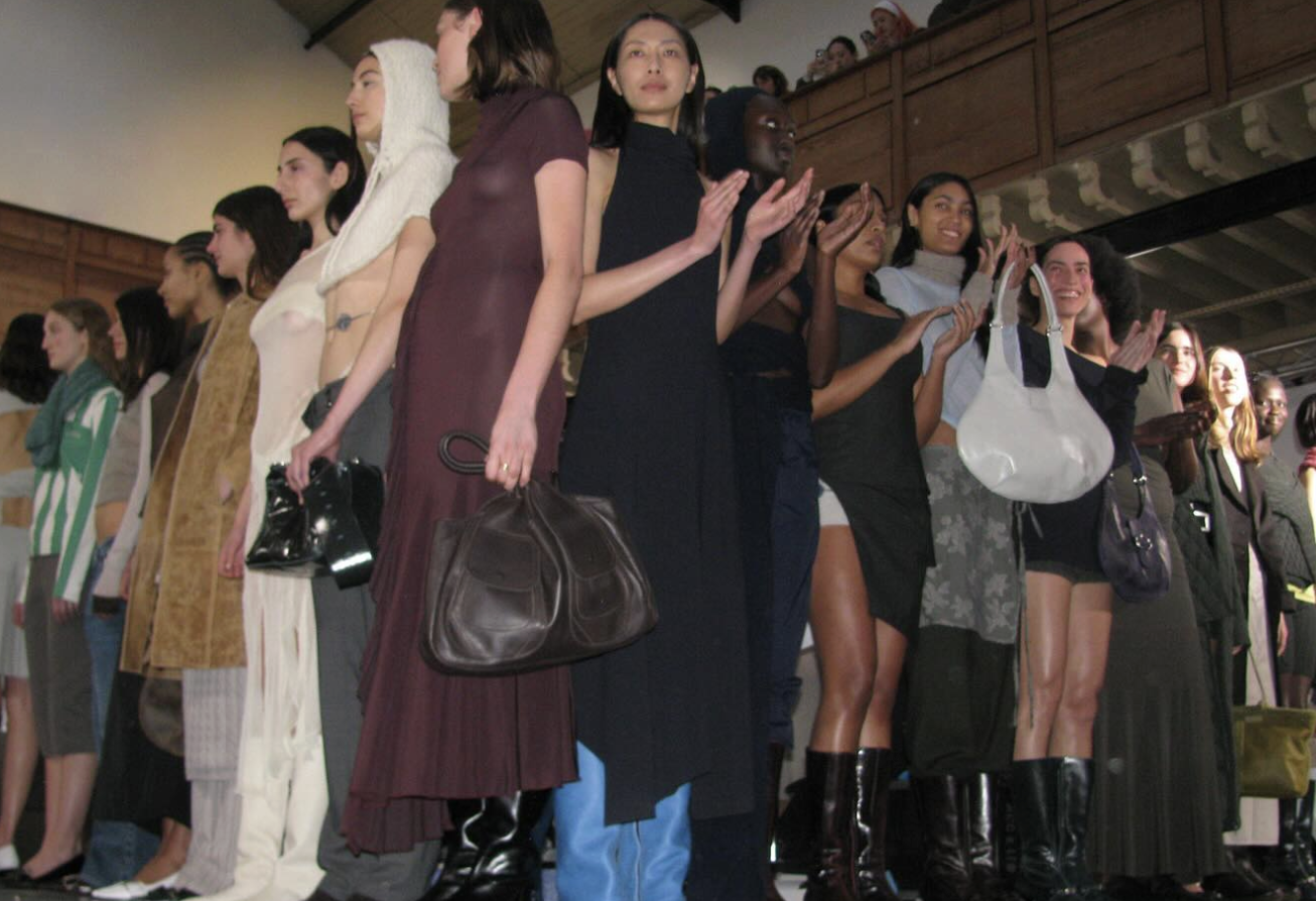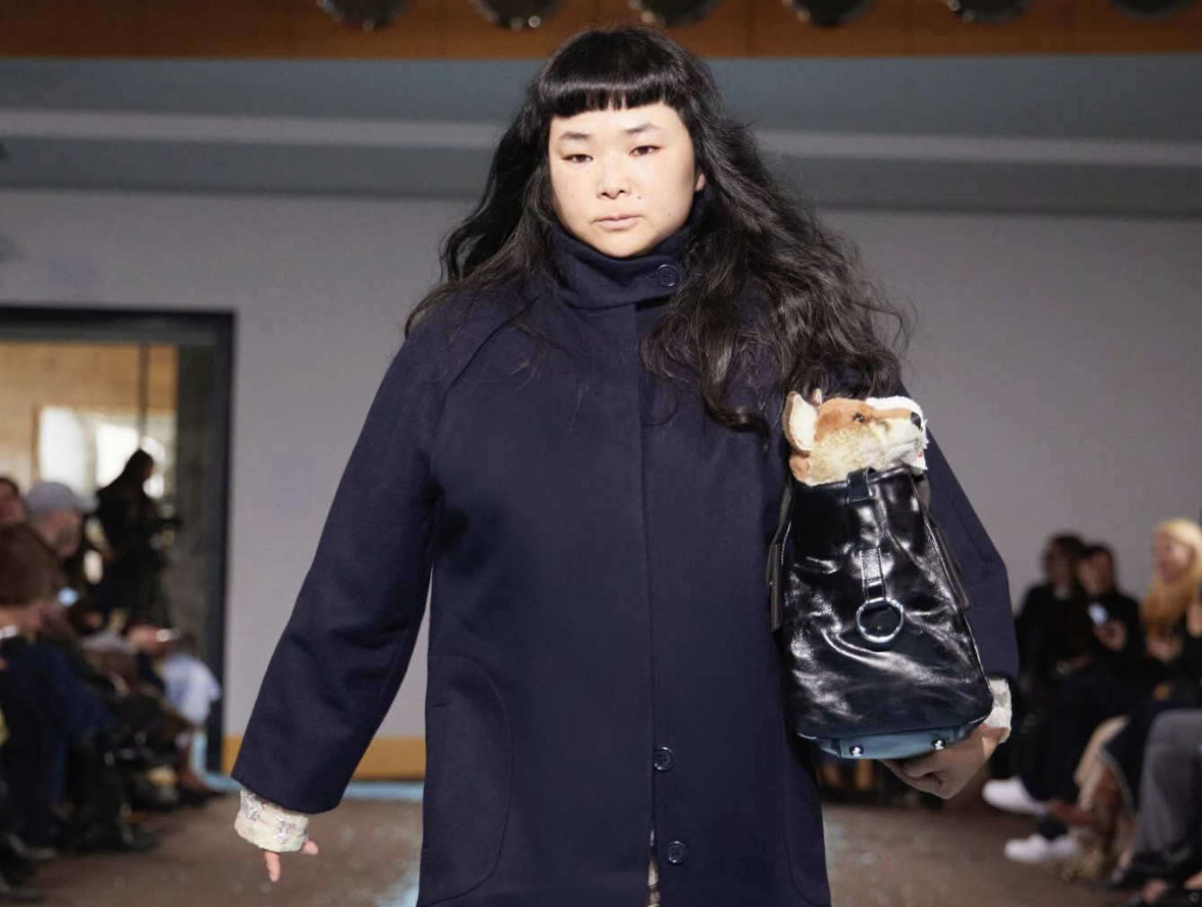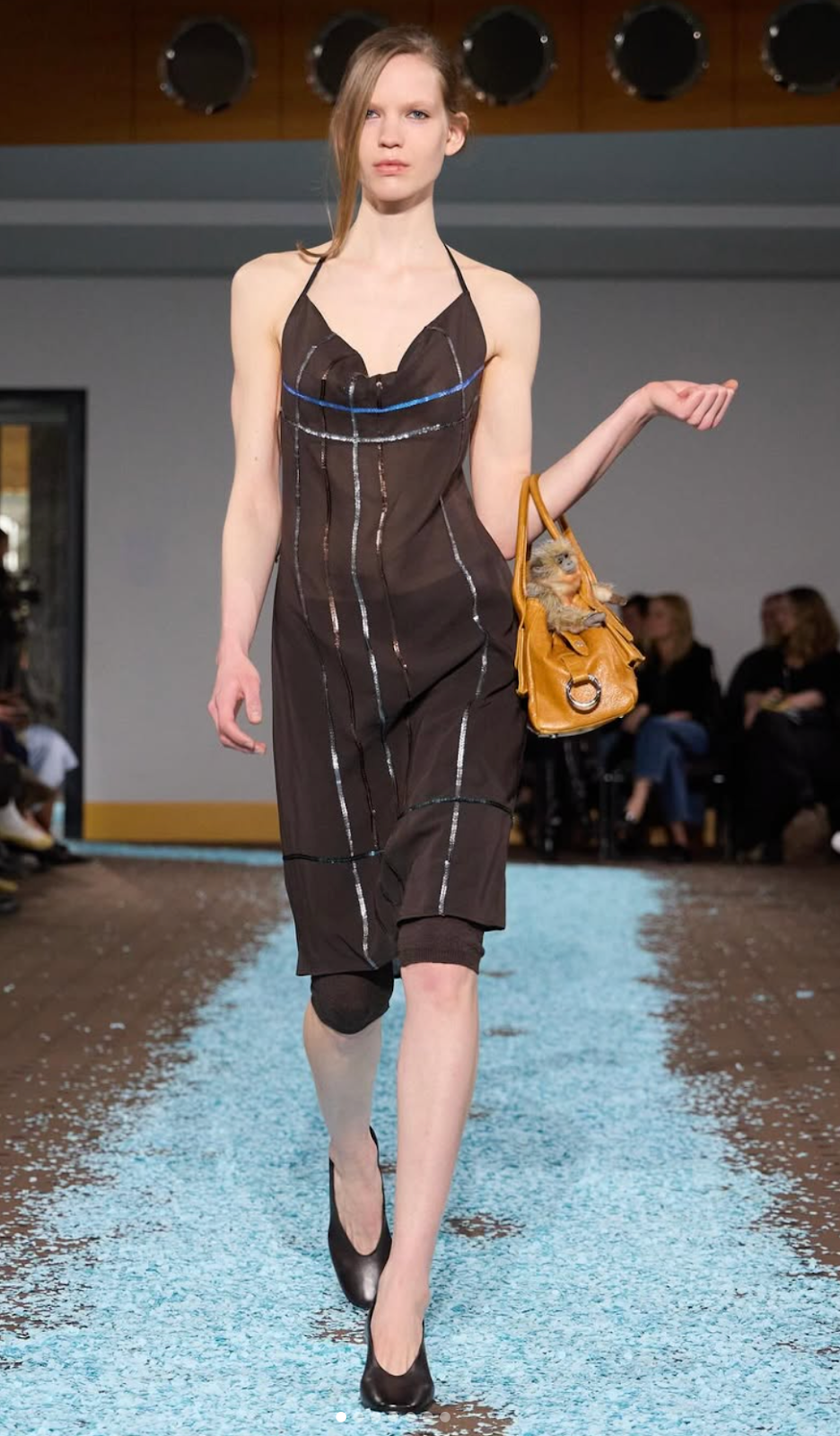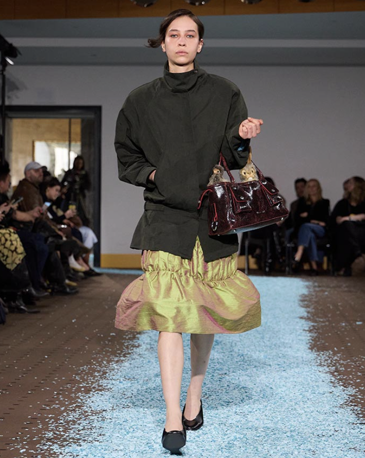 Paloma Wool is known for its minimalist aesthetic and cool-toned colors. Lanna’s AW26 collection, however, is the most playful of her works, exploring the new aesthetic of the brand. To start, some of the looks featured bags with stuffed animal dogs in them!