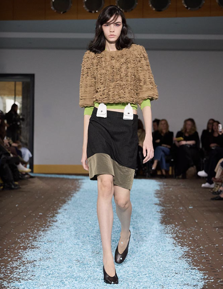 Again, we see this adding to the level of playfulness and in this case it acts almost as a contrast. The outfit is relatively monochrome and dull except for this huge hot pink bow wrapped around the model’s body and arms.