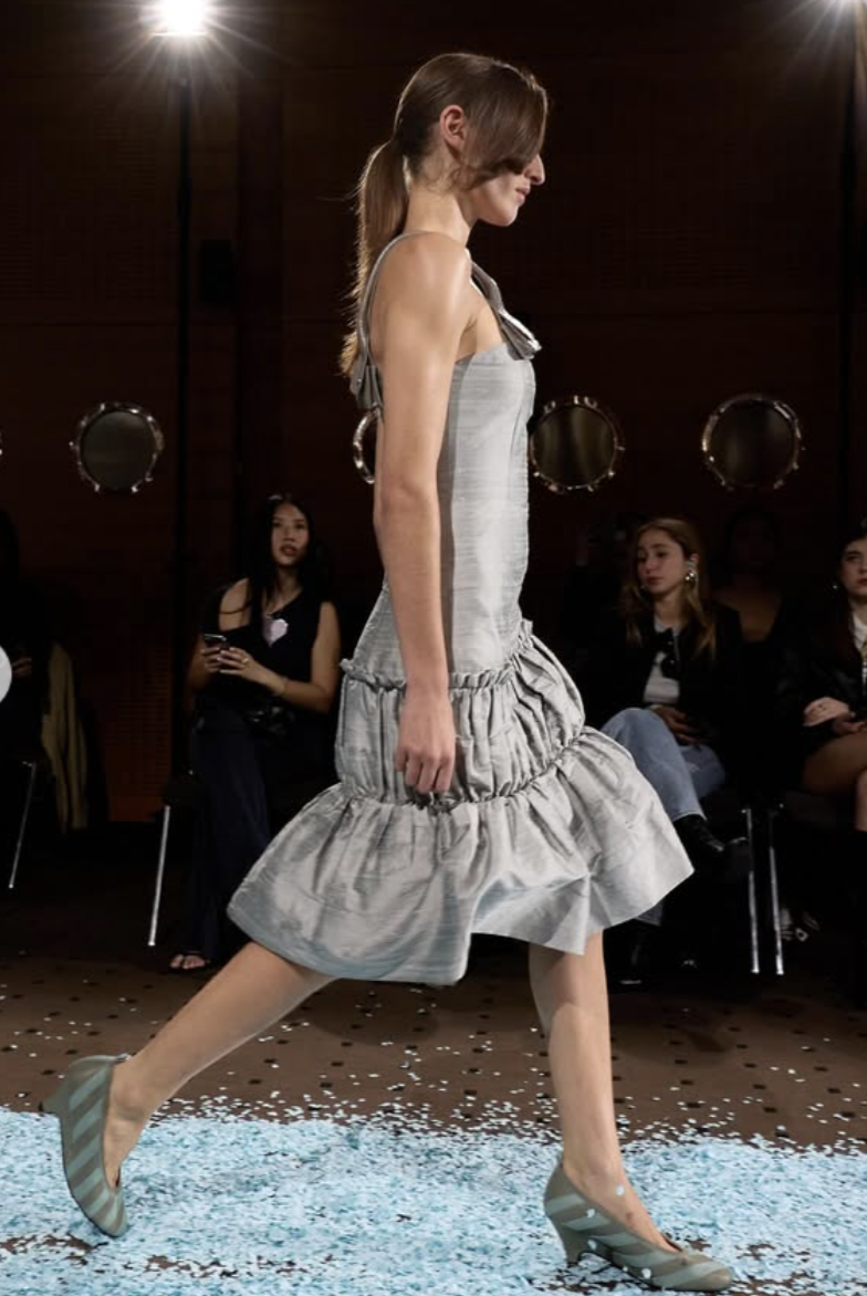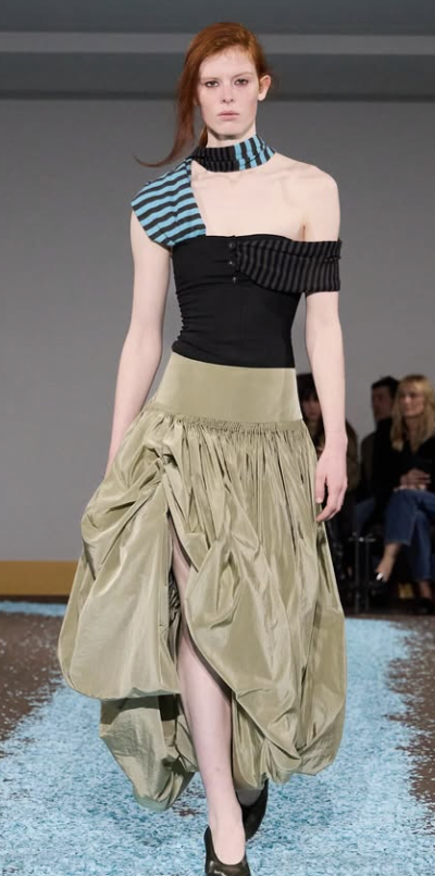 While there are many hints of the typical Paloma Wool style such as clean cuts, geometrical pieces, textured-focused, cool-toned colors, there were many parts of the runway that gave off a “grounded yet playful” feel. I view the stuffed animals as a nod to childhood. It’s as if Lanna is trying to communicate that even as we collectively grow up and things become serious (as seen through her corporate-looking outfits) it is important to remember and honor the inner child in all of us.