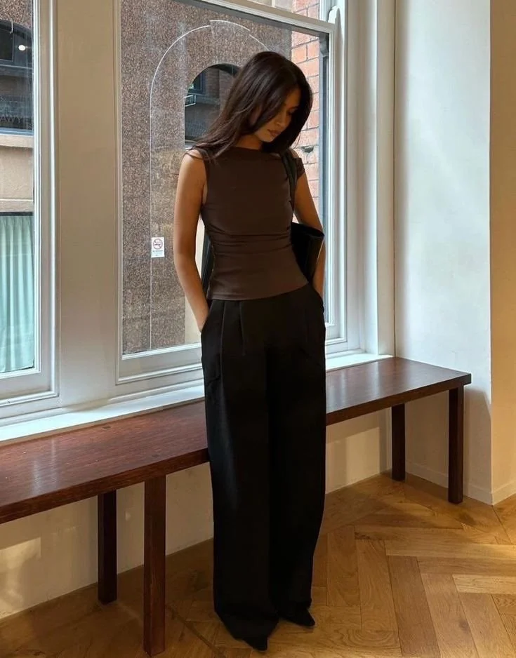 Another combination in the “clean business girl” realm could be slacks and a structured top. Something that gives you shape while still maintaining clean lines with the look: golden.