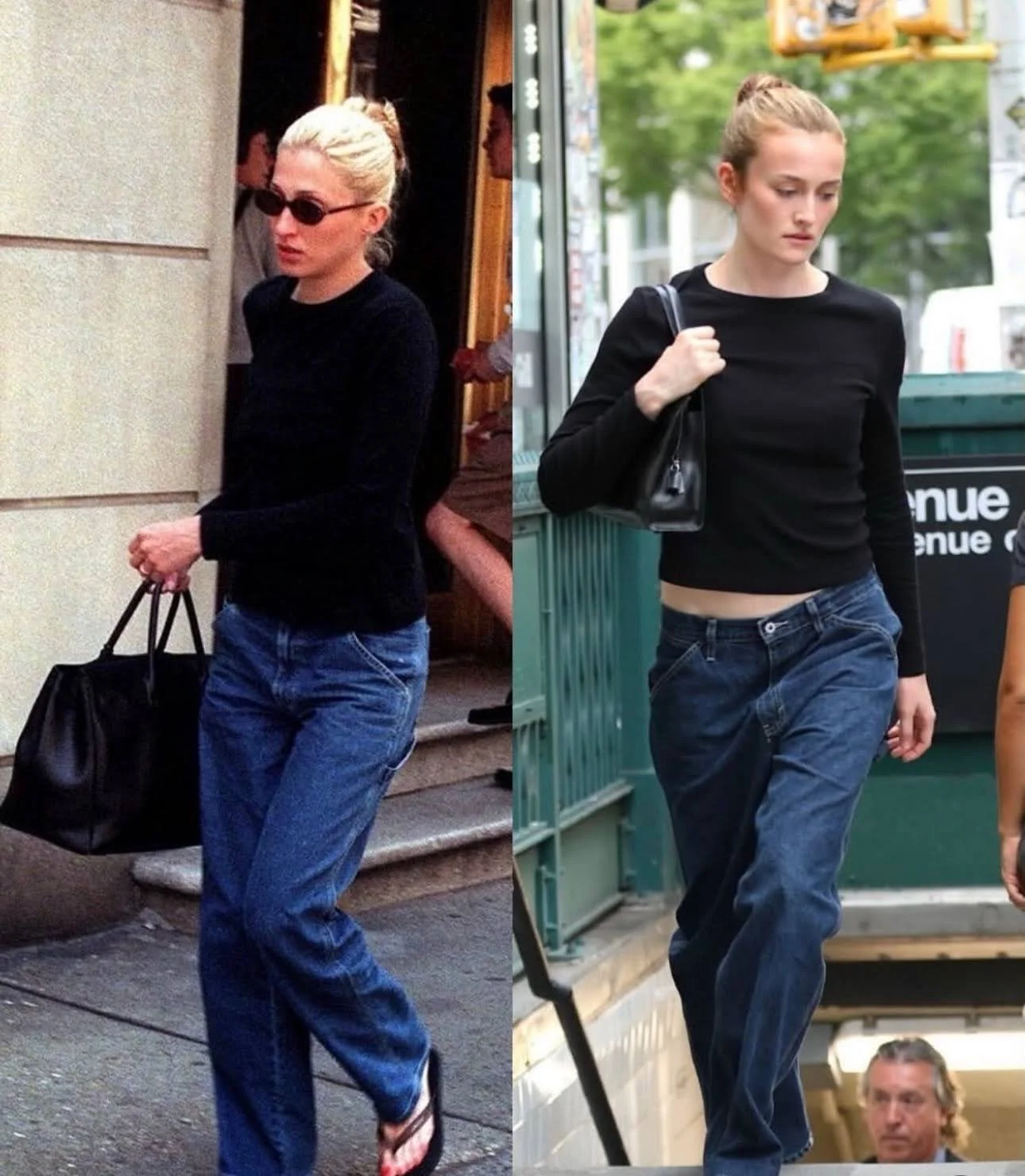 The 517 was mostly known as “Saddleman jeans”, typically worn by those who rode the saddle since they were western boots. Its bootcut design allowed space for a heeled boot that CBK often wore, creating a practical, chic look. As shown in the picture on the right, she’s in a red Prada coat with bootcut jeans. Although it is currently discontinued, the 517s can be found at stores like What Goes Around Comes Around in Lower Manhattan or The Consistency Project in Brooklyn.